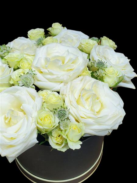 A chic hat box filled with beautiful cream roses, delicate cream spray roses and starlike astrantia - a fresh, elegant arrangement with a gentle timeless charm. A useful container it can be used when the flowers have gone.