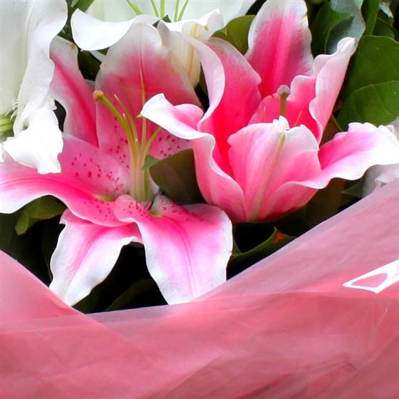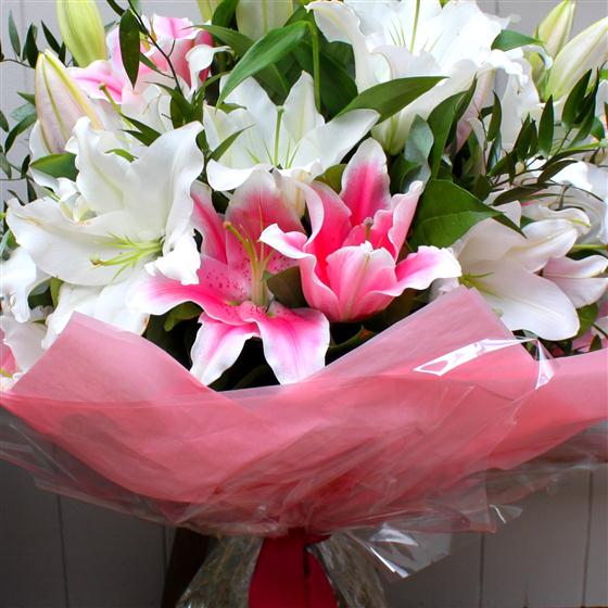 A hand tied bouquet of the finest lilies. Beautifully arranged with soft ruscus and seasonal foliage this bouquet is sure to please. Aqua packed for freshness and instant display.