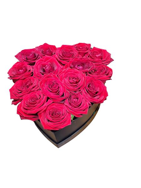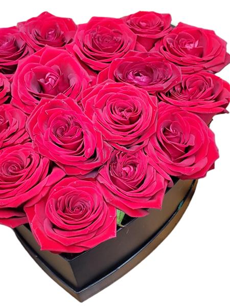 A beautiful heart shaped box filled with velvety red roses - bold, elegant and irresistibly romantic. The deep black casing makes the velvety crimson blooms glow with passion, creating a striking gift that speaks of devotion, desire and timeless love. The perfect gesture that lingers long after the roses are seen. Image is ofvthe large size.