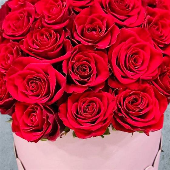 These velvety red roses are nestled tightly in this round pink hatbox, their deep crimson petals creating a striking contrast, against the soft blush container. A romantic, elegant Valentine's Day gift that speaks of love at a glance.