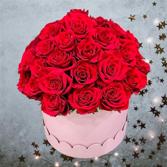 A blush-pink hat box cradling red velvety roses - a Christmas gift dipped in romance. Elegant, heartfelt and irresistibly dreamy it is the perfect way to say 'You are my Christmas magic'.