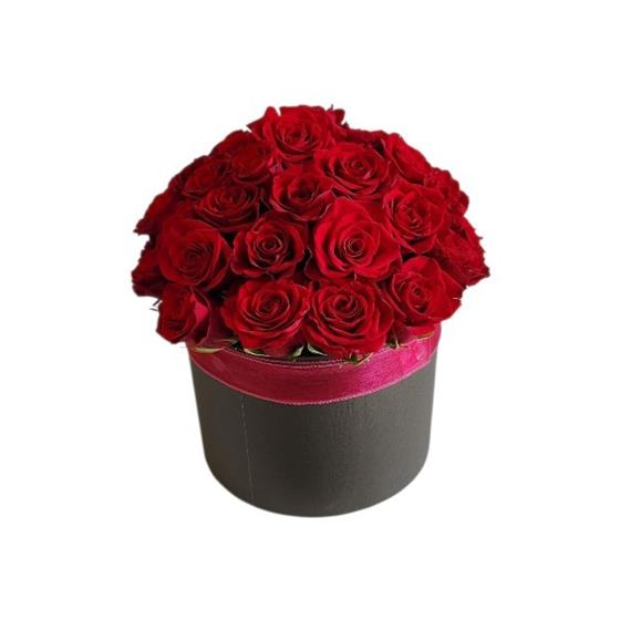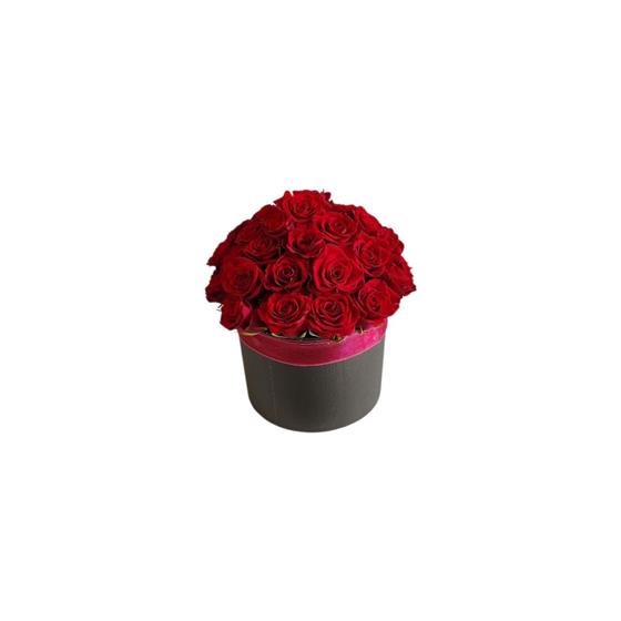 A sleek black round hat box brimming with red roses, their velvety petals glowing like embers in the Christmas light. Wrapped with delicate red organza ribbon, the arrangement feels rich, romantic and festive, speaking directly to the heart of your loved one.